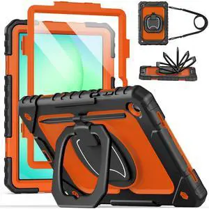 360 Rotatable Galaxy Tab A8 10.5" Case Sturdy Cover Rotate Ring Stand Shoulder Carrying Strap Hand Strap Rugged Children Adults Outdoor Case, Orange