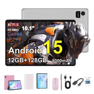 Crelander 10.1 Inch Android 15 Tablet, 12GB+128GB Android Tablet, 8000mAh Battery, 1280x800 Touchscreen, 5G WiFi/Bluetooth, Bundle with Case, Keyboard, Mouse & Stylus(Pink)