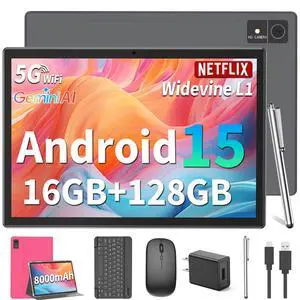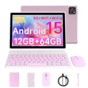 10 inch Tablet with Keyboard 2 in 1 Android 15 Tablets Include Case Wireless Mouse Stylus 6000mAh battery 8GB+32GB/1024GB Expandable 10.1" Tableta, Dual Camera tab 5G WiFi-6 Bluetooth Tablet PC (Pink)