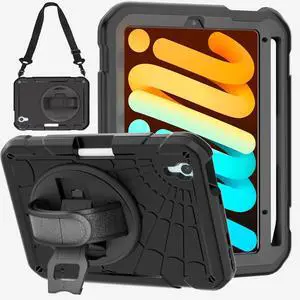 PZJI Case for iPad mini 7 (A17 Pro) 2024/ Mini 6 8.3'' with Pencil Holder [360 Rotating Hand Strap] &Stand, Drop-Proof Case for iPad mini 7th/6th Generation 8.3" (Black)