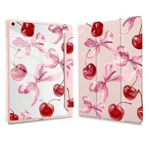 Joyland Cartoon Cherry for iPad 7th/8th/9th Generation Case (2019/2020/2021) 10.2 Inch,Built-in Pencil Holder with Shockproof Cover Clear Transparent Back Shell Auto Wake/Sleep,Pink