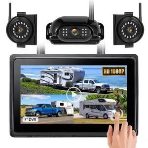 WOOCARTY Wireless RV Backup Camera System 7" 1080P Touch Screen & 3 Cameras, Compatible with Furrion Pre-Wired Plug, DVR Monitor & Waterproof Night Vision Rear Side View Camera for Trailer Truck, A13