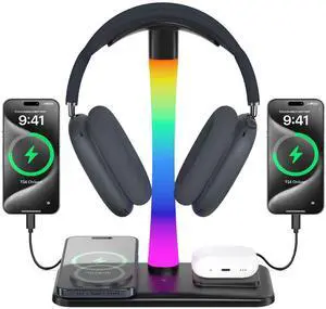 Headphone Stand with Wireless Charger,Gaming Headset stand with RGB Light Mode,For Airpod Max Stand Compatible with Airpod Pro/3/2,For iPhone 17/16/15/14/13/12/11,Gifts for Gamers & Music Lover(Black)