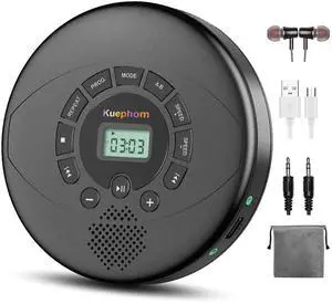 KUEPHOM Portable CD Player with Speakers and Bluetooth: Rechargeable Discman with Headphones, Anti-Skip Protection-CD/MP3/USB/BT Transmit/AUX Car Connection-Personal/Travel/Music/Audiobook (Black)