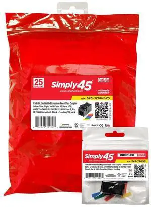 Simply45 Cat6 Unshielded Keystone Feed-Thru Coupler - Black, 25-Pack - Inline/Slim Style, Cat6 UTP, ANSI/TIA 568.2-D, ISO/IEC 11801 Class E. Supports S45 Snap-On ID Bars - S45-3260B-25