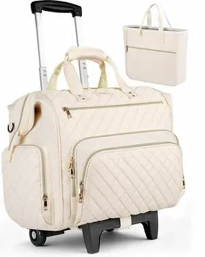 Awlcaw Rolling Teacher Bag, 16 Inch Rolling Laptop Bag with Detachable Dolly & Teacher File Tote, Large Roller Briefcase for Teaching Office Work, Women, Craft Nurse,Beige