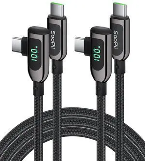SOOPII 100W Right Angle USB C to USB C Cable,2Pack 4FT Zinc Alloy Case Nylon Braided Type-C Cable with LED Display for lPad Mini/Air/Pro,MacBook Pro,Samsung S23/S22/S10,Pixel,LG(1.2m,Black)