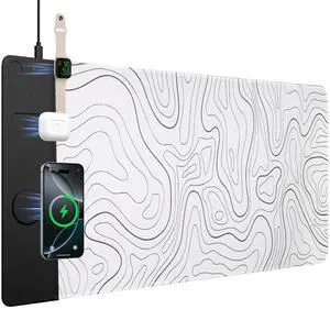 VOVIPO 3 in 1 Wireless Charging Mouse Pad, Desk Mat with Wireless Charger Multiple Devices Compitable with Watch/iPhone, White Topographic Large Desk Mat(80 x 40cm) for MacBook, PC, Laptop