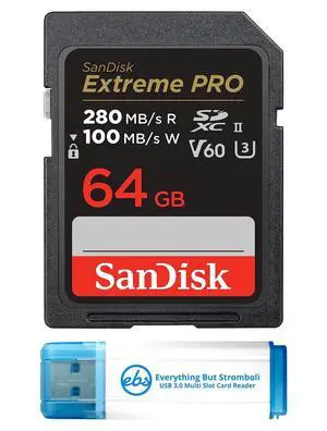 SanDisk UHS-II 64GB Extreme Pro SDXC Memory Card 280MB/s Read Speed V60 Class 10 Card for Photo and Video (SDSDXEP-064G-GN4IN) Bundle with 1 Everything But Stromboli 3.0 Micro & SD Card Reader