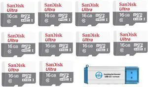 SanDisk Ultra SDSQUNS-016G-GN3MN 16GB (10 Pack) UHS-I Class 10 microSDHC Card Bundle with (1) Everything But Stromboli 3.0 SD/TF Micro Reader