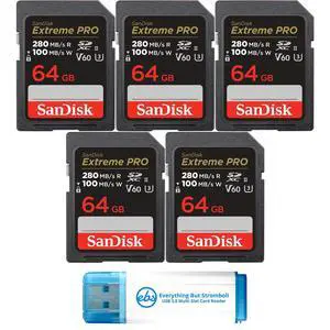 SanDisk (5 Pack) SDXC Memory Card 64GB UHS-II Extreme Pro V60 for Photo and Video (SDSDXEP-064G-GN4IN) Bundle with 1 Everything But Stromboli Micro & SD Card Reader