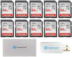 SanDisk 64GB 10 Pack Memory Card SD Ultra UHS-I Class 10 (SDSDUNB-064G-GN6IN) Bundle with (1) Everything But Stromboli SDXC & MicroSD Card Reader & (1) Everything But Stromboli Micro Fiber Cloth