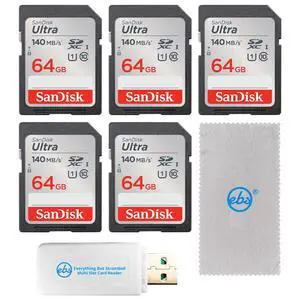 SanDisk 64GB SD Card 5 Pack SD Ultra UHS-I Class 10 (SDSDUNB-064G-GN6IN) Bundle with (1) Everything But Stromboli SDXC & MicroSD Memory Card Reader & (1) Everything But Stromboli Micro Fiber Cloth