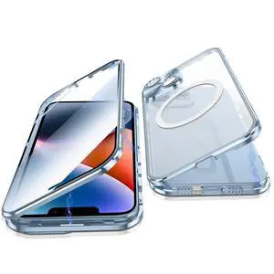Jonwelsy Case for iPhone 14, 360 Degree Double-Sided Protection Compatible with Magsafe Magnetic Adsorption Metal Bumper Front Tempered Glass Back Frosted PC Cover for iPhone 14 6.1" (Blue)
