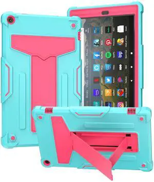 Shockproof Case for Fire HD 10 Tablet (7th/9th Generation, 2017/2019 Version), Techcircle Multi-Angle Heavy Duty Bumper Defender Child Proof Rugged Case w/Kickstand Silicone Hybrid Cover, Green+Rose
