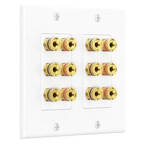Cable Matters Double Gang Speaker Wire Wall Plate, Gold Plated Speaker Wall Plate with Banana Plug Binding Post for 6 Speakers, White