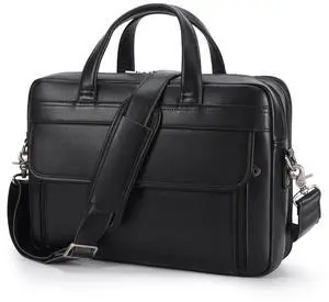 Masa Kawa Black Leather Briefcase for Men 15.6 Inch Laptop Computer Messenger Crossbody Shoulder Bag Business Travel Work Lawyer Teacher Brief Attache Case