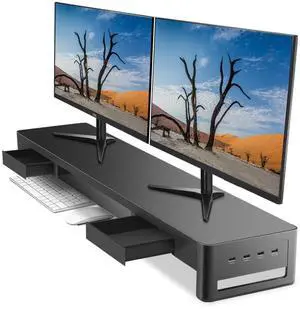meatanty Dual Monitor Stand Riser with 2 Storage Drawers and 4 USB Ports, Metal Stand for 2 Monitors Supports Data Transfer and Charging, Desk Organizer for PC, iMac (38.7 inches)