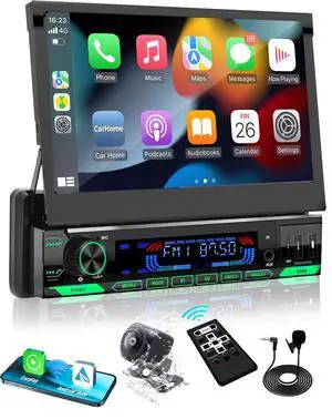 Y-METDRVIING Motorized Single Din Wired Carplay Car Stereo with Bluetooth 5.1, 7 Inch flip Out Touchscreen Car Radio MP5 Player,Flip up car Stereo with Android Auto, Mirror Link/USB/FM/Backup Camera
