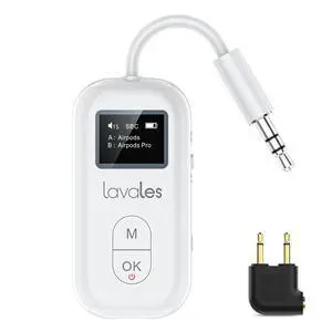 Lavales Bluetooth 5.3 Transmitter Receiver for Airplane, Wireless Audio Adapter for 2 Headphones, aptX Adaptive/SBC/HD,100ft Long Range, 35h Playtime, 3.5mm AUX Adapter for TV, Speakers, MP3
