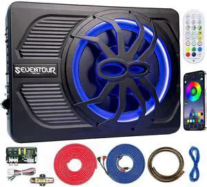 10" Upgrade 800W Slim Under Seat Powered Car Subwoofer, Car/Truck Audio Sub Built in Amplifier amp Combo, with Blue LED Light (RGB LED Subwoofer+Installation Wire Kit)