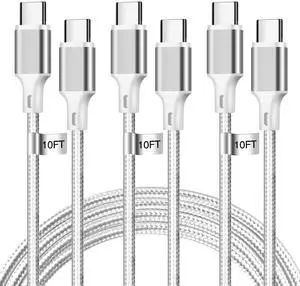 cugunu USB C to USB C Charger Cable, Nylon Braided 3Pack 60W 10FT Type C Fast Charging Cord Compatible for iPhone 15/16/17/Pro/Max/Plus, iPad, Air5, MacBook, Samsung, Google-Silver