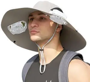Mens Sun Hat with 2 Fan, Summer Cooling Wide Brim Bucket Hat, Beach Hat Garden Hat, Solar + USB Dual Power Supply, Great for Outdoor Travel, Mountaineering, Gardening, Fishing,Grey 1#,One Size
