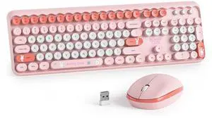 Mosptnspg Girly Keyboard and Mouse Wireless, 2.4GHz Full-Sized Cute Pink Keyboard Mouse Set with Retro Typewriter Round Keys for Windows, Computer, Laptops, PC (Dot Pink)
