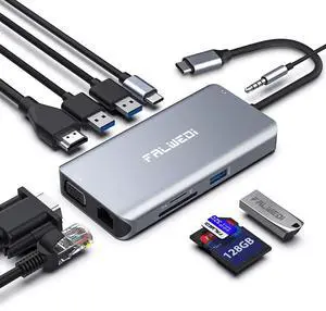 USB C Hub, Type C Adapter, FALWEDI 10-in-1 Dongle with Ethernet, 4K@30Hz HDMI, VGA, 3 USB3.0, SD/TF Card Reader, Mic/Audio, USB-C PD 3.0, Compatible for MacBook Air Pro and Other Type C Laptops