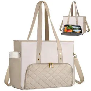 Jetviivid Lunch Tote Bag for Women, 15.6 Inch Laptop Bag with Insulated Lunch Compartment & Cup Holder for Work, Office,Teacher,College, Daily, Khaki&White