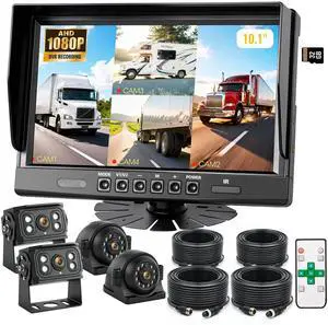 WOOCARTY 4-Wired Backup Camera System, 10.1" DVR Quad Screen Rear Side View Cameras, IP69 Waterproof IR Night Vision, 20G Vibration-Proof for Trailer/RV/Tractor/Combine/Skid Steer/Heavy Equipment, Y4