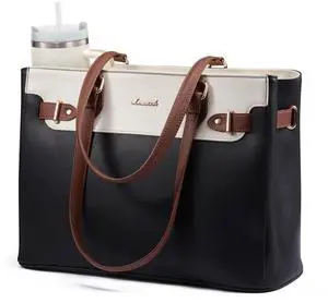 LOVEVOOK Laptop Tote Bag for Women Work, Teacher Tote Bag Nurse Bag with Large Cup Holder, 17.3 Inch Waterproof Leather Computer Bag Professional Business Office Briefcase, Black-beige-brown
