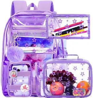 WZLVO Clear Bookbag for Girls, 17" Women Heavy Duty PVC Transparent Bookbag, Cute Stadium Approved See Through School Bags for Elementary Preschool - Magical Purple Star