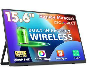 ZSCMALLS Battery Wireless Portable Monitor, 8000mAh 15.6" 1080P IPS USB-C/HDMI Second Screen, Built-in Speakers, Support AirPlay/Miracast for Laptop/Phone/Tablet/Switch/Xbox