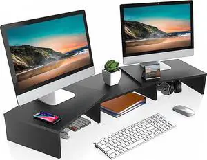 FITUEYES Dual Monitor Stand 3 Shelf Computer Monitor Riser, Wood Desktop Stand with Adjustable Length and Angle, Desk Accessories, Office Supplies Medium Black,DT108001WB