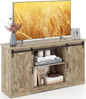 Tangkula Sliding Barn Door TV Stand for TVs up to 65, Farmhouse Entertainment Center with Adjustable Shelves & Storage Cabinet, Media Console Table with Cable Holes, TV Cabinet for Living Room