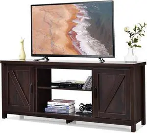 Tangkula Modern Farmhouse TV Stand with Double Barn Doors, 59 inch TV Storage Cabinet for TVs Up to 65 Inches, Adjustable Shelves, Wood Entertainment Center Console Table for Living Room (Coffee)