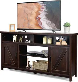 Tangkula Barn Door TV Stand, TV Console Table for TVs up to 65 Inch, Media Entertainment Center with 2 Cabinets & Adjustable Shelves, Wooden TV Stand for 25-Inch Fireplace (Not Included) (Coffee)