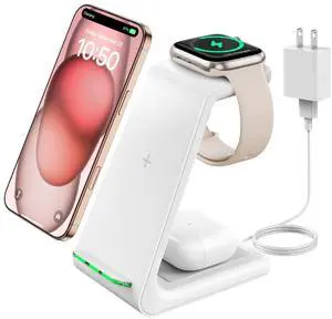 GEEKERA 3 in 1 Wireless Charging Station for Apple, Fast Wireless Charger Stand Dock for iPhone 17 16 15 14 13 12 11 Pro Max Plus XR XS X, Apple Watch Ultra/11/10/9/SE/8/7/6/5/4/3/2, AirPods Pro/4/3/2