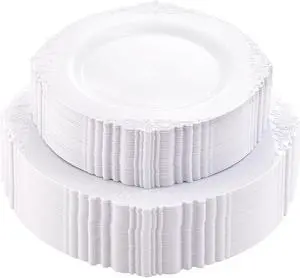 100PCS White Plastic PlatesWhite Disposable PlatesInclude 50 Pieces 10.25 Inch Dinner Plates & 50Pieces 7.5 Inch Dessert Plates,Perfect for Weddings & Party