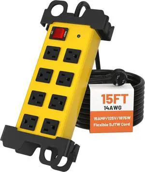 8 Outlet Heavy Duty Power Strip, 2700J Surge Protector with 15FT Extension Cord, Industrial Metal Powerstrip 15Amp, Wall Mount for Garage Workshop Outdoor Home Office, Wide Spaced (15ft)