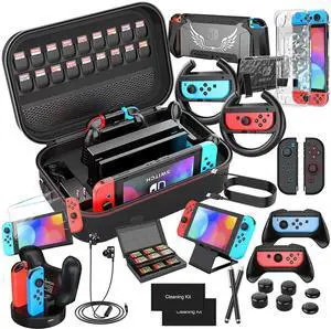 Switch OLED Accessories - 28 in 1 Family Accessory Bundle Kit for Nintendo Switch OLED Edition Carrying Case&Tempered Glass Protector,Joy Con Charger, Gaming Steering Wheels, Grips and More