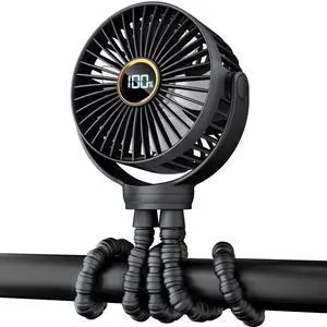 Portable Stroller Mini Fan, Small Rechargeable Personal Fan, Baby Travel Essentials for Wagon, Car Seat, Treadmill, Battery Powered Biking Gear Accessories, 360° Rotation, 3-Speed, Display, Black