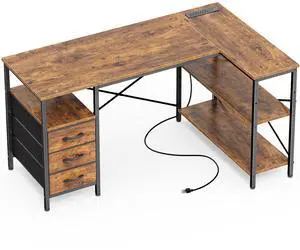 L Shaped Office Desk with Power Outlets, 47 Inch Computer Desk with 3 Drawers, Shelves, for Gaming, Corner Work, Home Office, Study, Rustic Brown