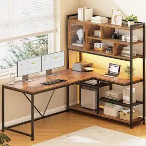 SEDETA L Shaped Computer Desk, 58'' Office Desk with LED Light and Bookshelf, L Shaped Corner Desk with Storage Shelves for Home Office, Gaming Desk, L Desk, Rustic Brown