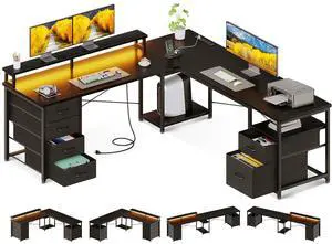 AODK 66" L Shaped Computer Desk, 113 Reversible Home Office Desk with File Cabinet & 4 Fabric Drawers, Two Person Desk with LED Lights & Power Outlet, Corner Gaming Desk with Monitor Shelf, Black