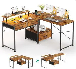 SEDETA L Shaped Desk, 66" Home Office Desk with Wood File Drawer, Power Outlet, Corner Computer Desk with Monitor Shelf, Printer Storage Shelves, Gaming Desk with Led Lights, Two Person Desk, Walnut