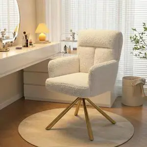 Kiztir Vanity Chair No Wheels Upholstered Teddy Vanity Chair with Back Home Office Desk Chair Boucle Accent Chair Modern Reading Chair Armchair Living Room, Bedroom (Beige)