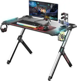 47 Inch Gaming Desk with Carbon Fibre Surface Large Computer Desk Gaming Table Ergonomic Pc Gaming Workstation Home Office Desks with Cup Holder & Headphone Hook