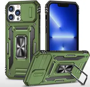 Military Grade Ring Holder Case with Camera Lens Cover for iPhone 14 Pro Max - Green